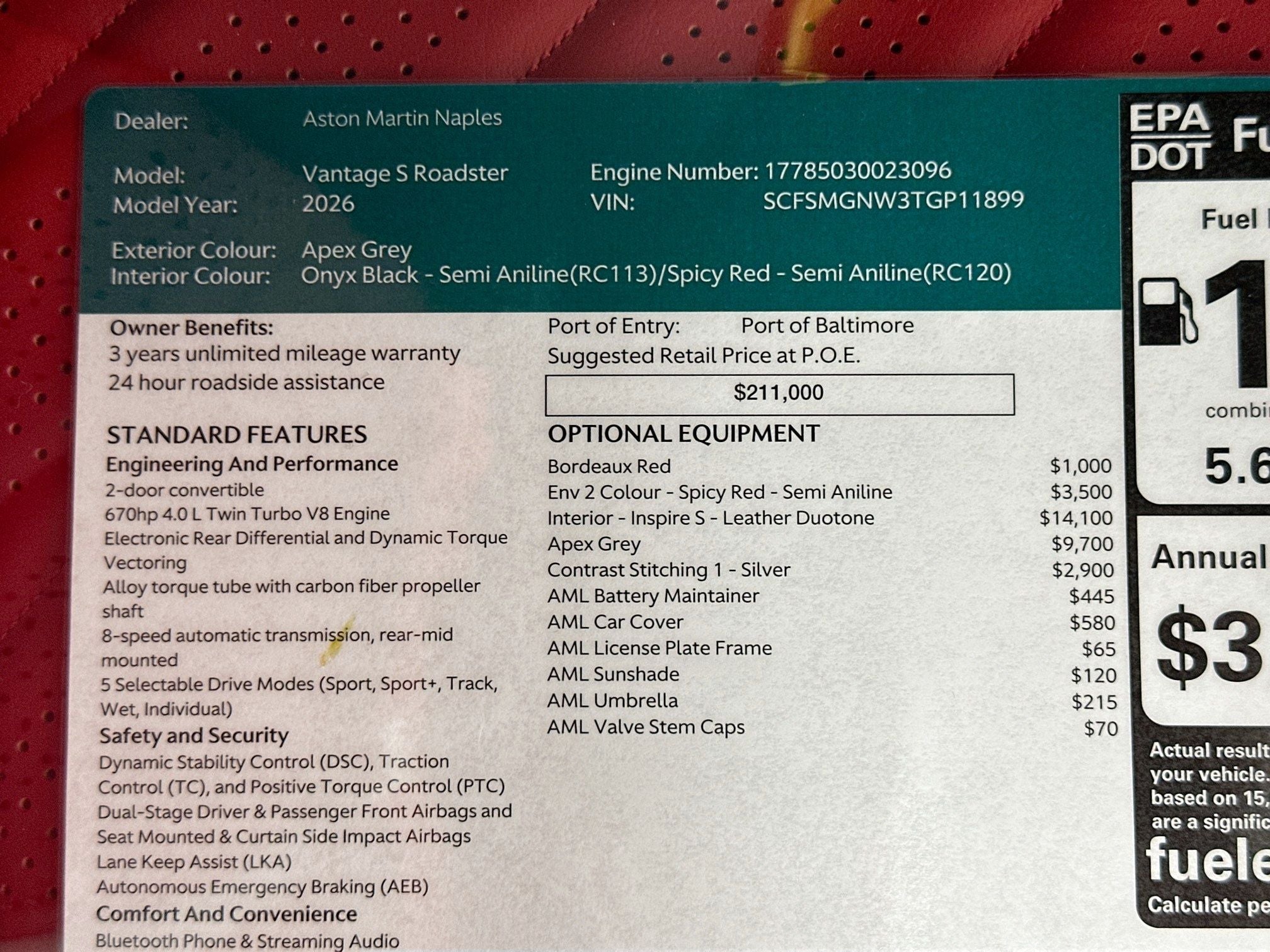 - Fuel Economy Est-Combined (MPG): 18